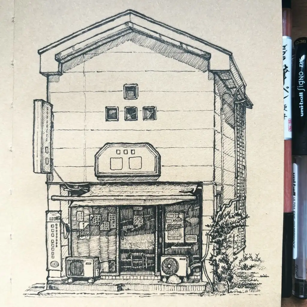 • Example: The second image presents a hand-drawn ink sketch of a Japanese-style storefront, rich with textures and minute details.