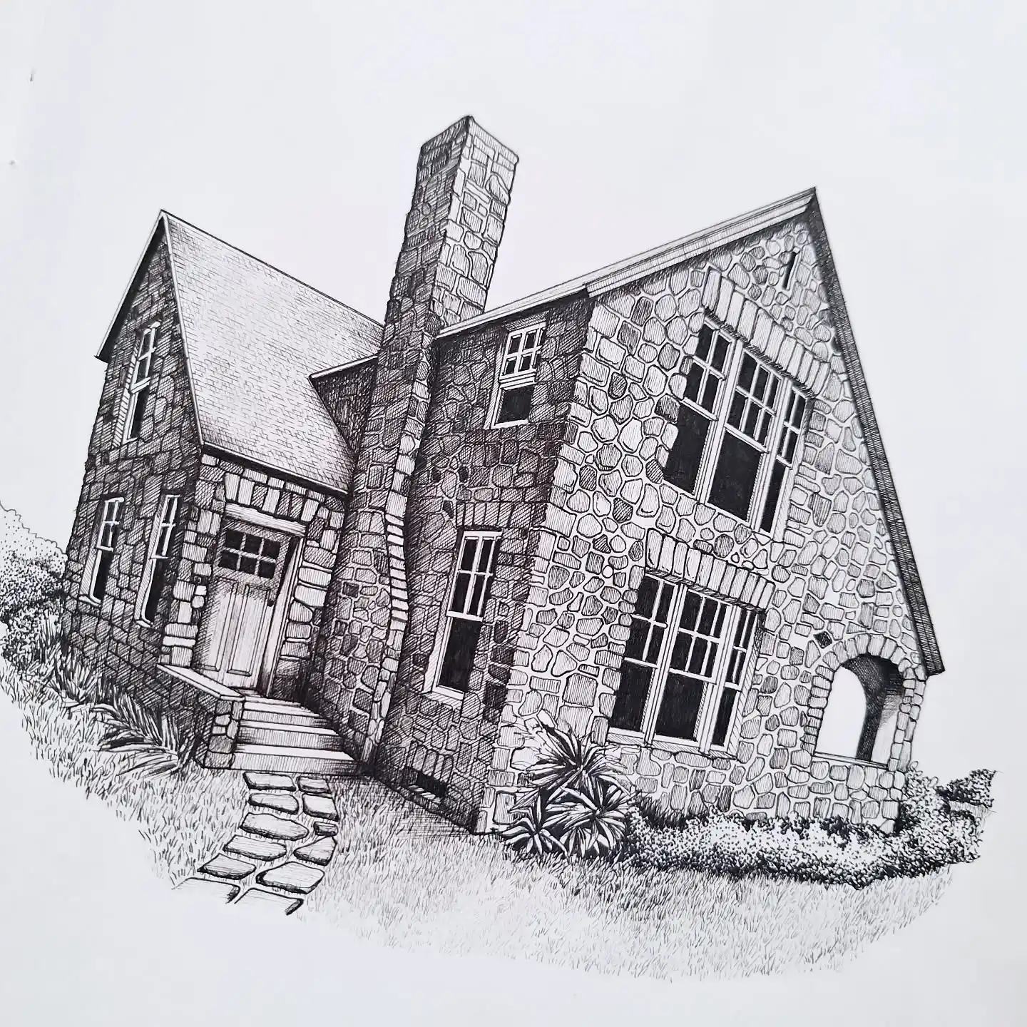 • Example: The image showcases a meticulously detailed stone house, where individual stones and architectural features are brought to life through cross-hatching and stippling.