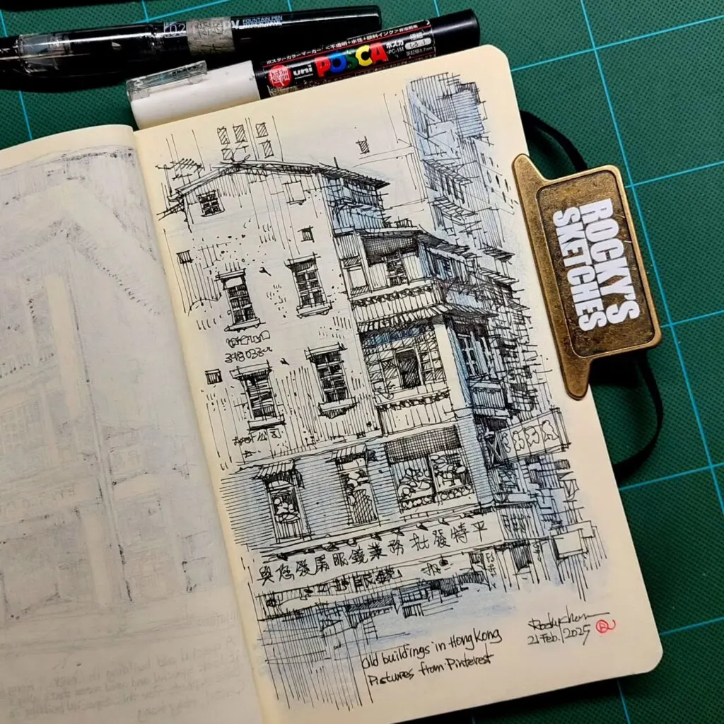 • Example: The image is an intricate ink sketch of a Hong Kong street scene, capturing traditional architecture alongside modern elements like air conditioning units and signage.