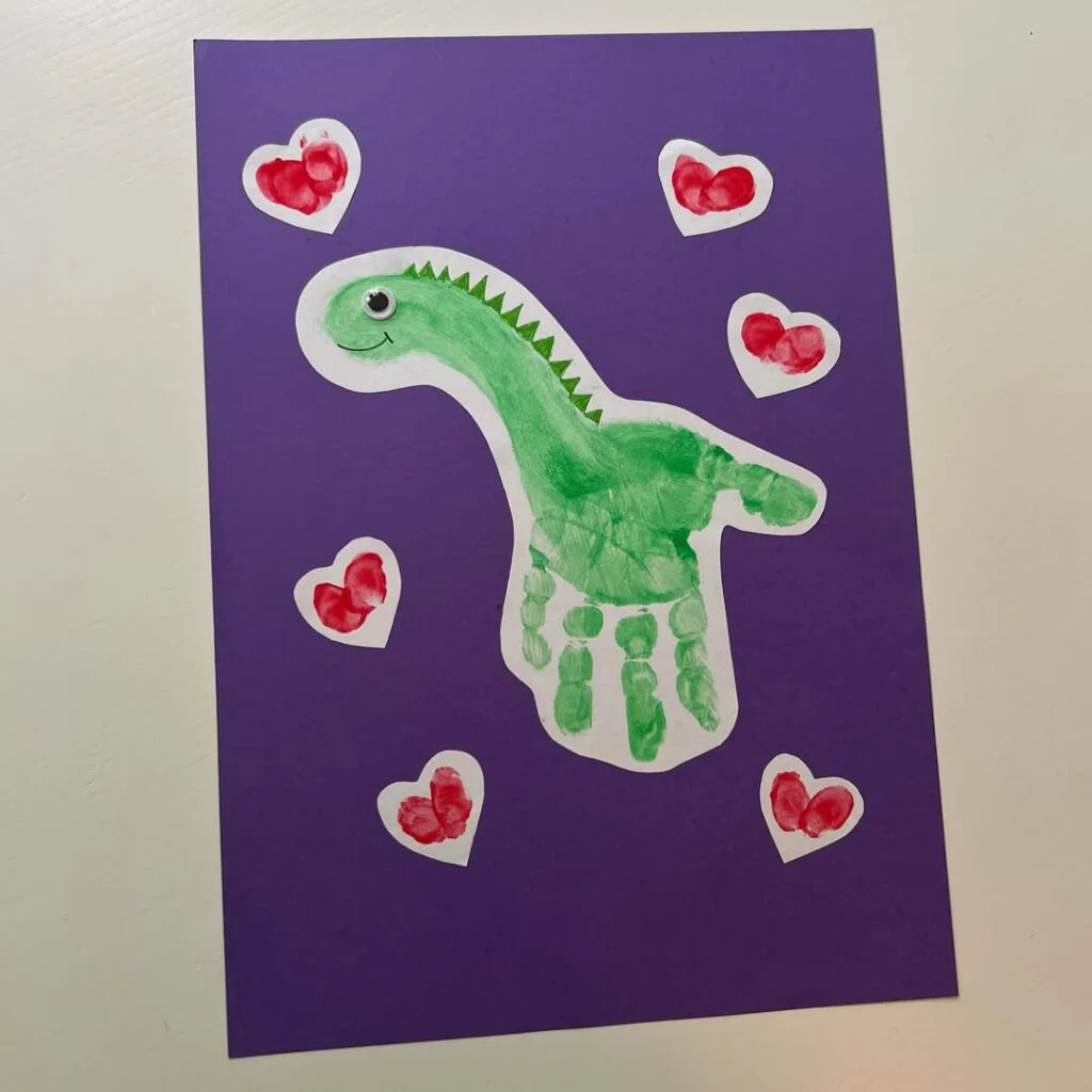 Use a green hand print to shape the body of a friendly dinosaur, then add a long neck, spiky back, and a smiling face. Surrounded by heart prints, this craft is a roaringly cute way to combine dino fun with a little extra love—perfect for Valentine’s Day or dino-themed playdates.