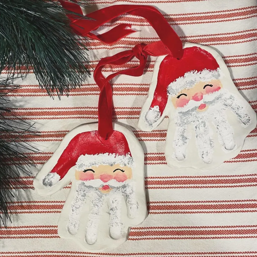 Create adorable Santas by shaping hand prints in clay and painting on jolly faces, hats, and snowy beards. Add a ribbon to hang them on the tree—these handmade keepsakes make festive holiday memories that last year after year.