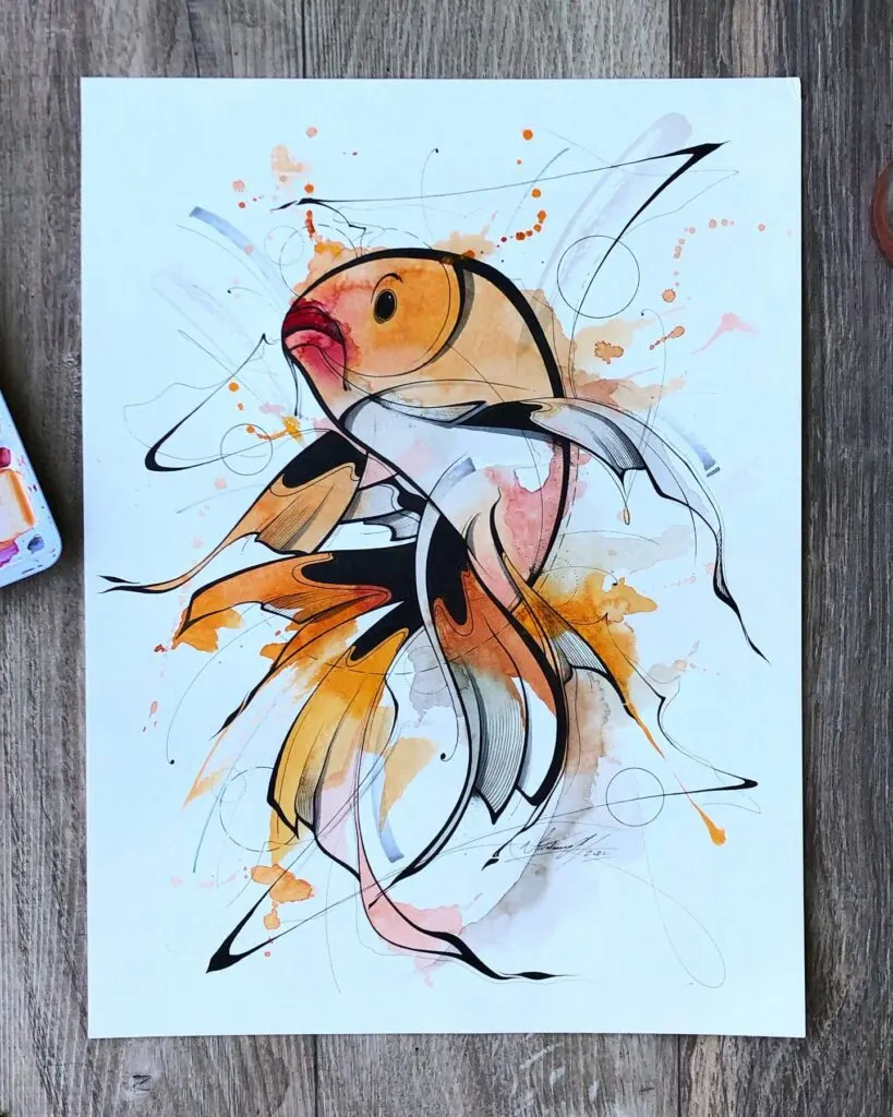 Experiment with vibrant watercolor splashes surrounding a simple koi line drawing. This contrast between precision and chaos highlights the koi’s natural beauty.