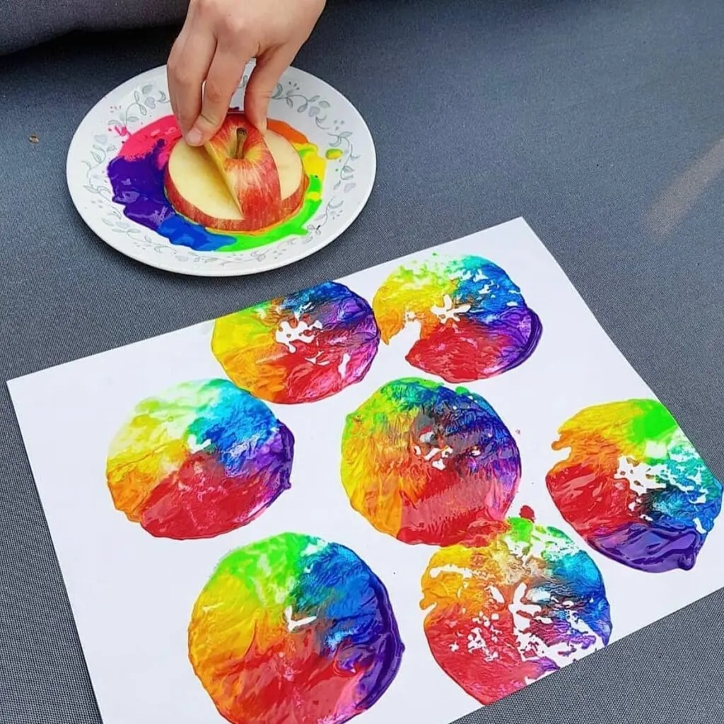 Slice apples horizontally to reveal star-like cores and stamp them in rainbow colors. It’s a magical way to teach color blending and spectrum basics.