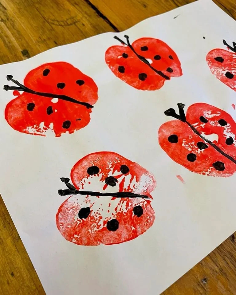 Stamp red apple halves, then paint a black line, dots, and tiny antennae. This cute bug-themed craft is a hit for springtime or garden unit projects.