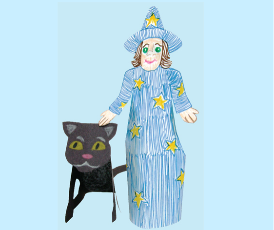 - Cut it out and decorate with markers—pointy hat, broomstick, striped stockings.