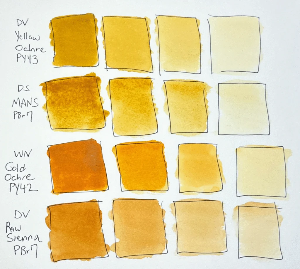 Another trick is to darken yellow with earth tones—Burnt Sienna, Raw Umber, or Yellow Ochre. These pigments are already muted versions of yellow, so they pull bright yellows into golden, earthy ranges without turning green.