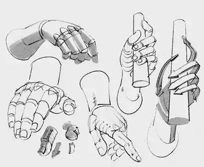 - The hand: Think of the palm as a block, thick at the base and tapering slightly at the fingers. Fingers are cylinders, each joint slightly shorter than the last, radiating not in parallel but like a fan. The thumb is unique: a block set at an angle, capable of opposition.