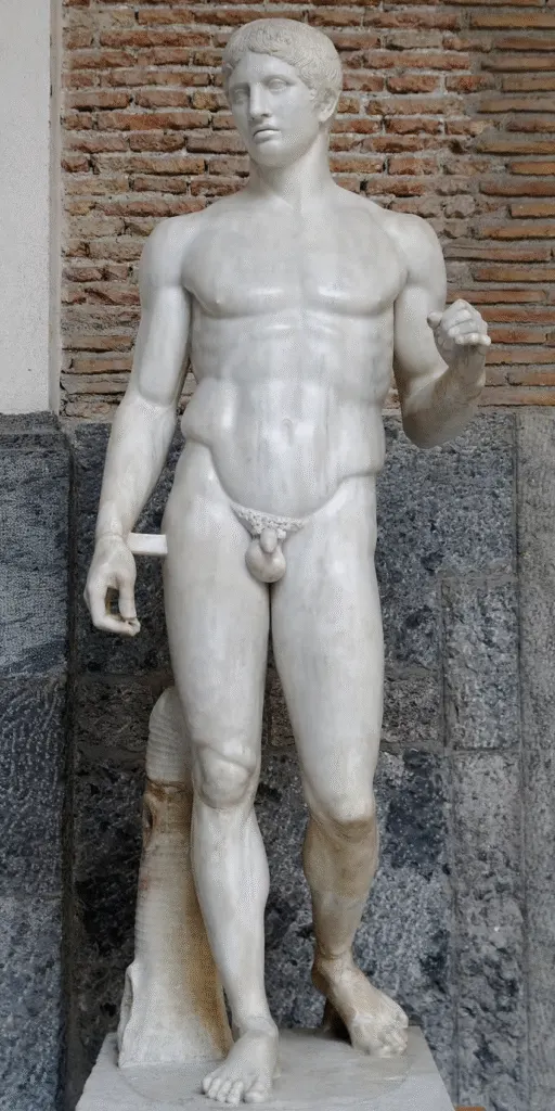 The figure exemplifies Polykleitos’ canon of ideal proportions. The torso and stance are rendered with remarkable anatomical harmony, yet the hands and feet are relatively simplified. The right hand, which once held a spear, is smoothed and neutral rather than expressive, showing how Greek sculptors often prioritized overall balance over detailed extremities