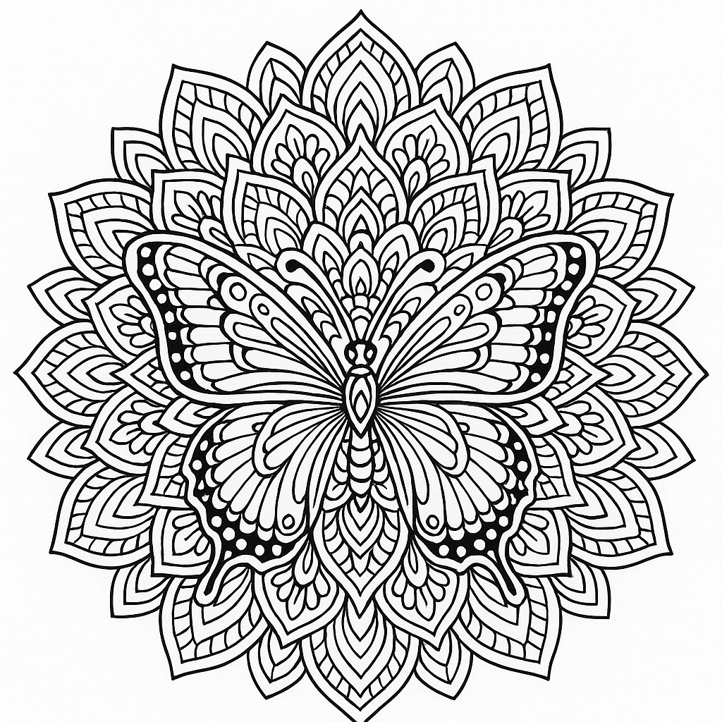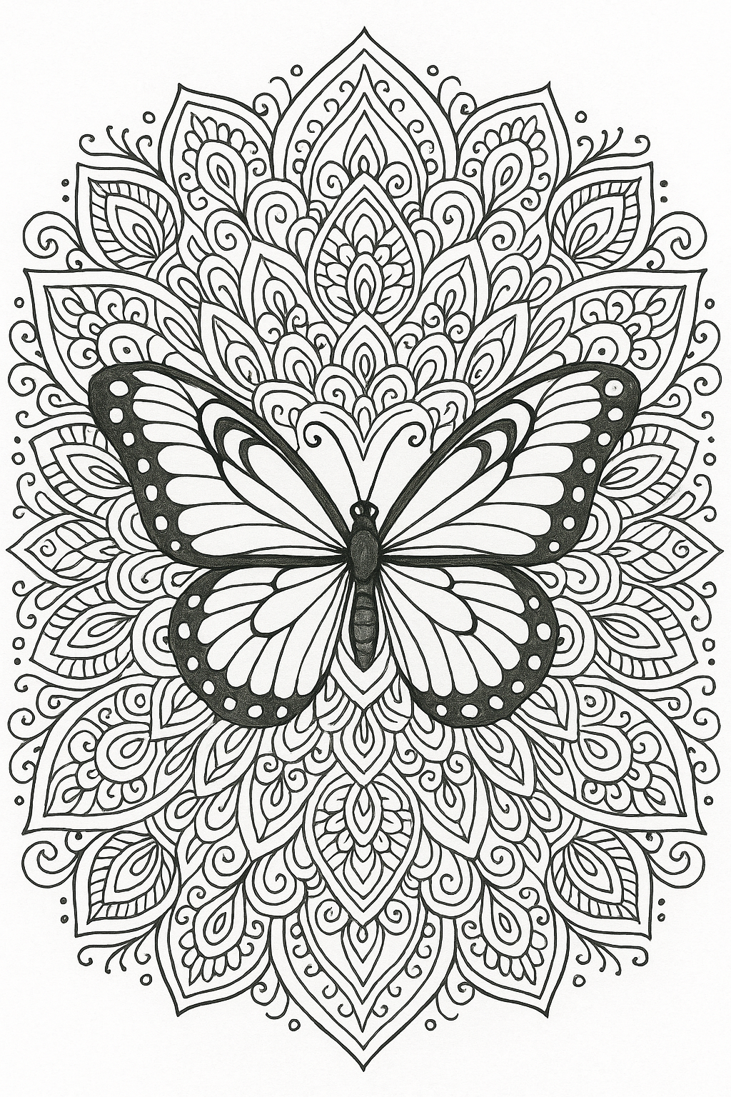 Intricate designs where butterflies merge with mandalas. These are especially calming, helping focus your attention as you fill in repetitive shapes.